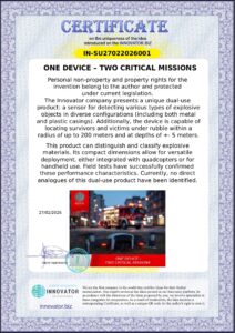 The Innovator company presents a unique dual-use product: a sensor for detecting various types of explosive objects in diverse configurations (including both metal and plastic casings). Additionally, the device is capable of locating survivors and victims under rubble within a radius of up to 200 meters and at depths of +- 5 meters.